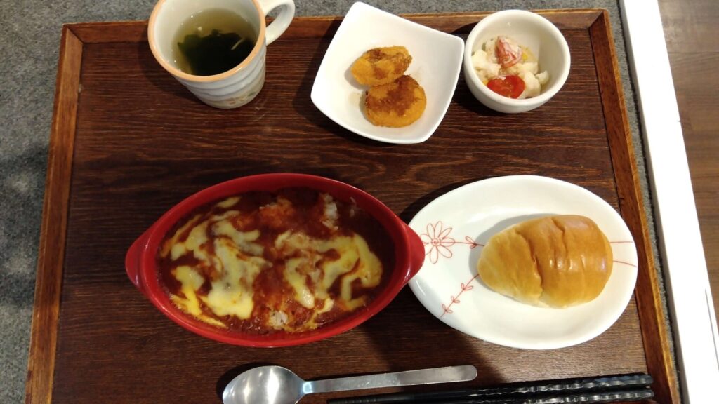 付け合わせは、ごはん・ホタテフライ・カリフラワーのサラダ・コンソメスープ・茶碗蒸しです。