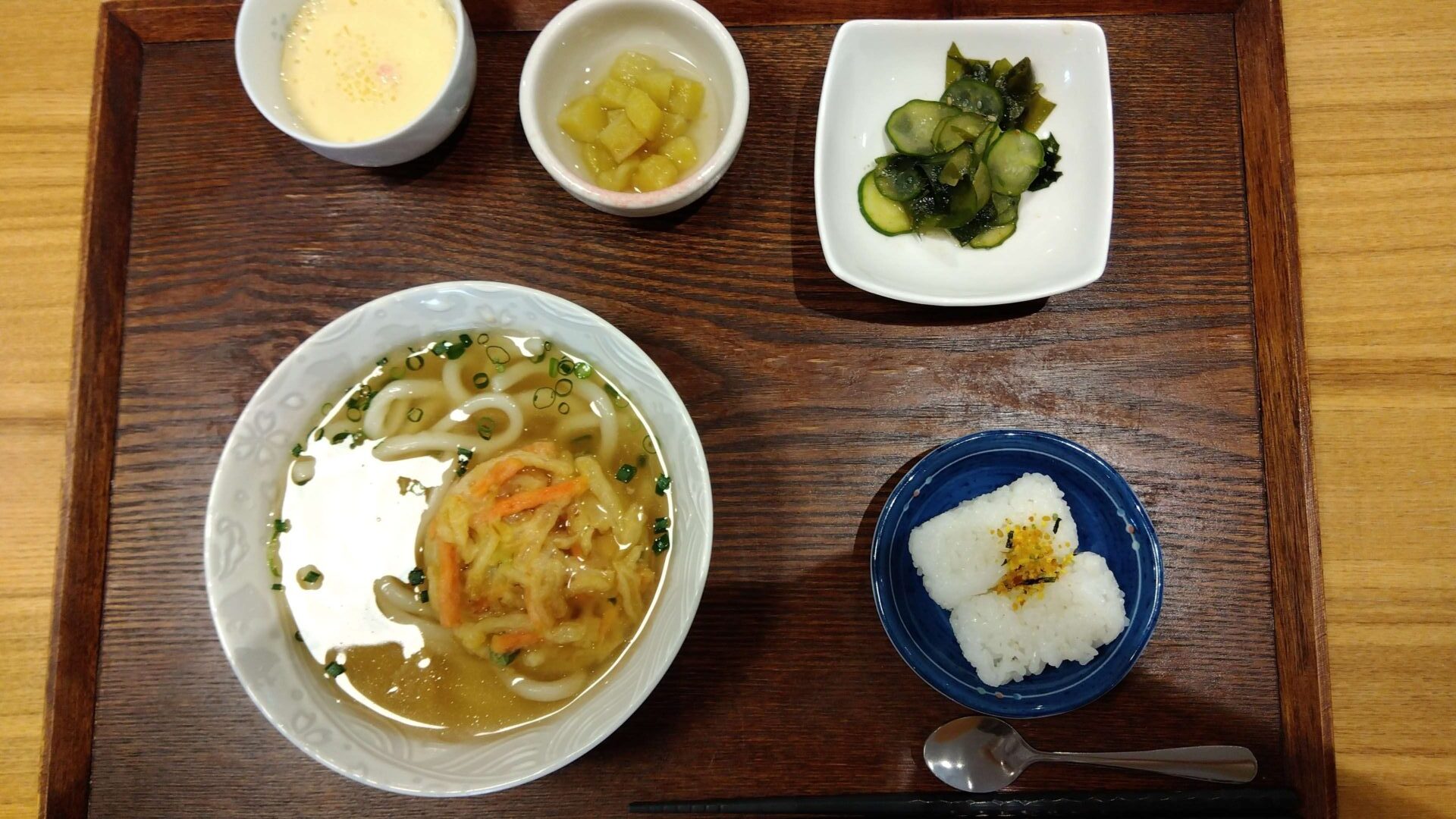 本日の麺定食は、『かきあげうどん(そばにも変更可能です)』。 付け合わせは、おにぎり・さつまいもの甘煮・胡瓜とハムの中華サラダ・茶碗蒸しです。