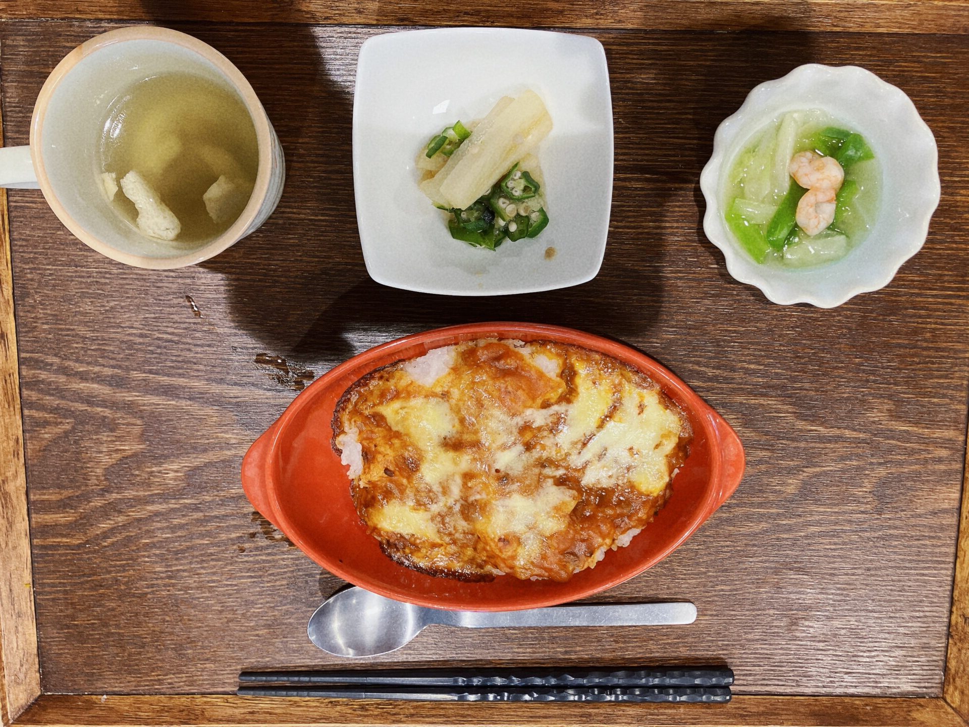 付け合わせは、ごはん・えびとキャベツのうま塩炒め・オクラと長芋のネバネバサラダ・茶碗蒸しです。