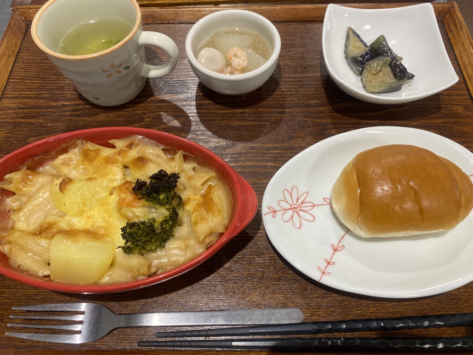 付け合わせ、パン(ごはんにも変更可能です)大根のうすくず煮、茄子のごまよごし、中華スープです。