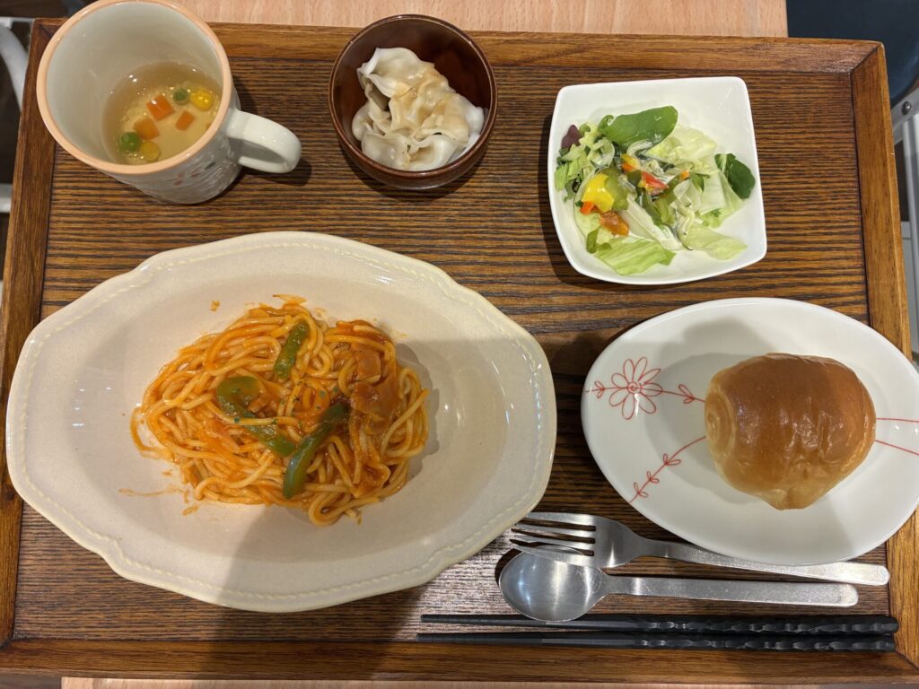 本日のパスタランチは、『ナポリタン』 付け合わせは、パン(ごはんにも変更可能です)・懐かしまろやかナポリタン・彩りサラダ・コンソメスープです。