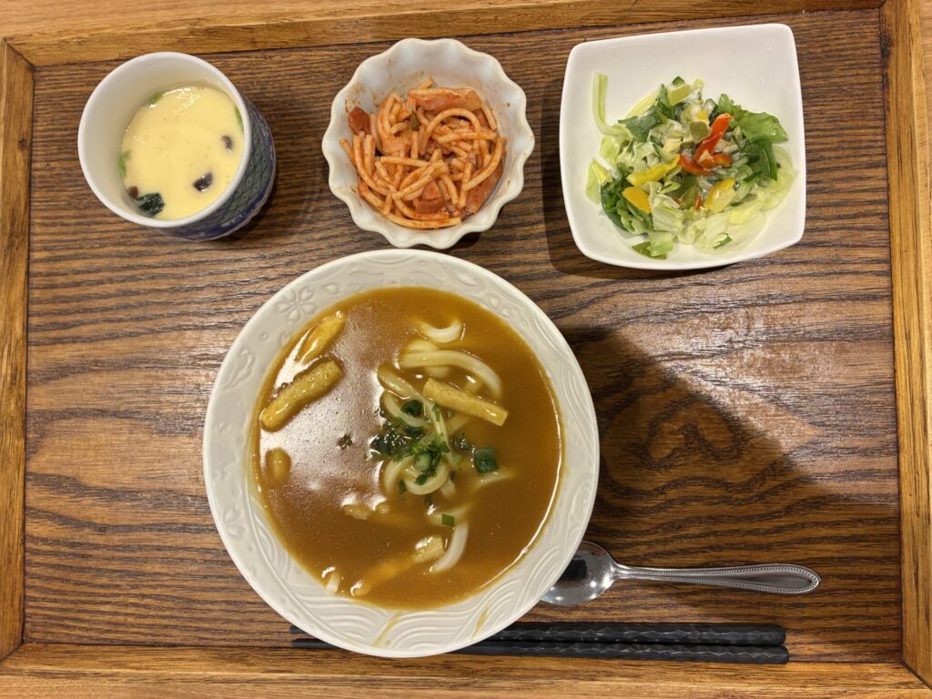 本日の麺定食は、『カレーうどん(そばにも変更可能です)』。 付け合わせは、おにぎり・懐かしまろやかナポリタン・彩りサラダ・茶碗蒸しです。