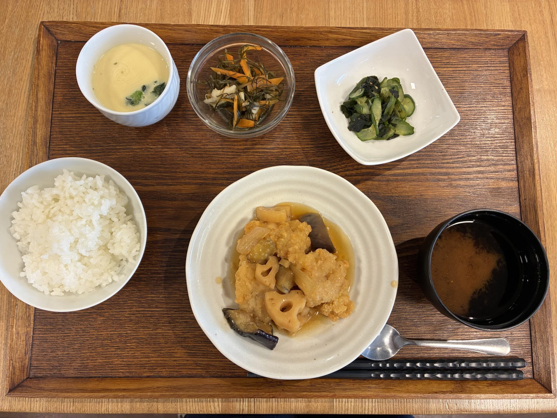付け合わせは、ごはん・糸昆布煮・胡瓜のピリ辛和え・味噌汁・茶碗蒸しです。