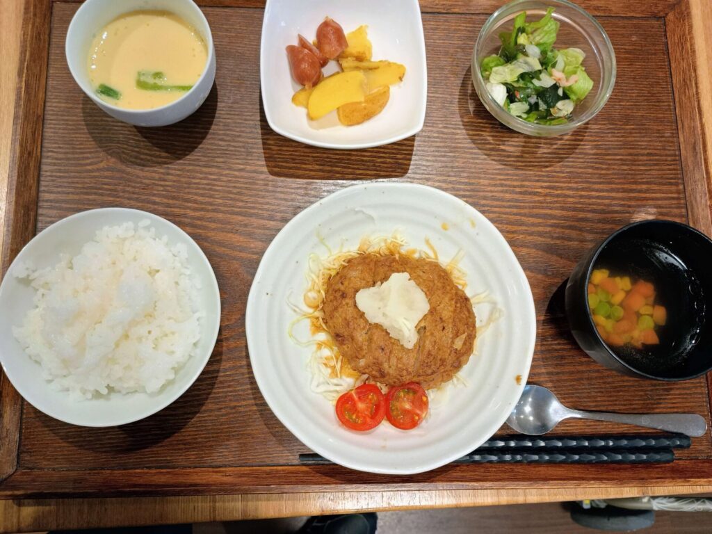 付け合わせは、ごはん・ジャーマンポテト・海藻サラダ・コンソメスープ・茶碗蒸しです。
