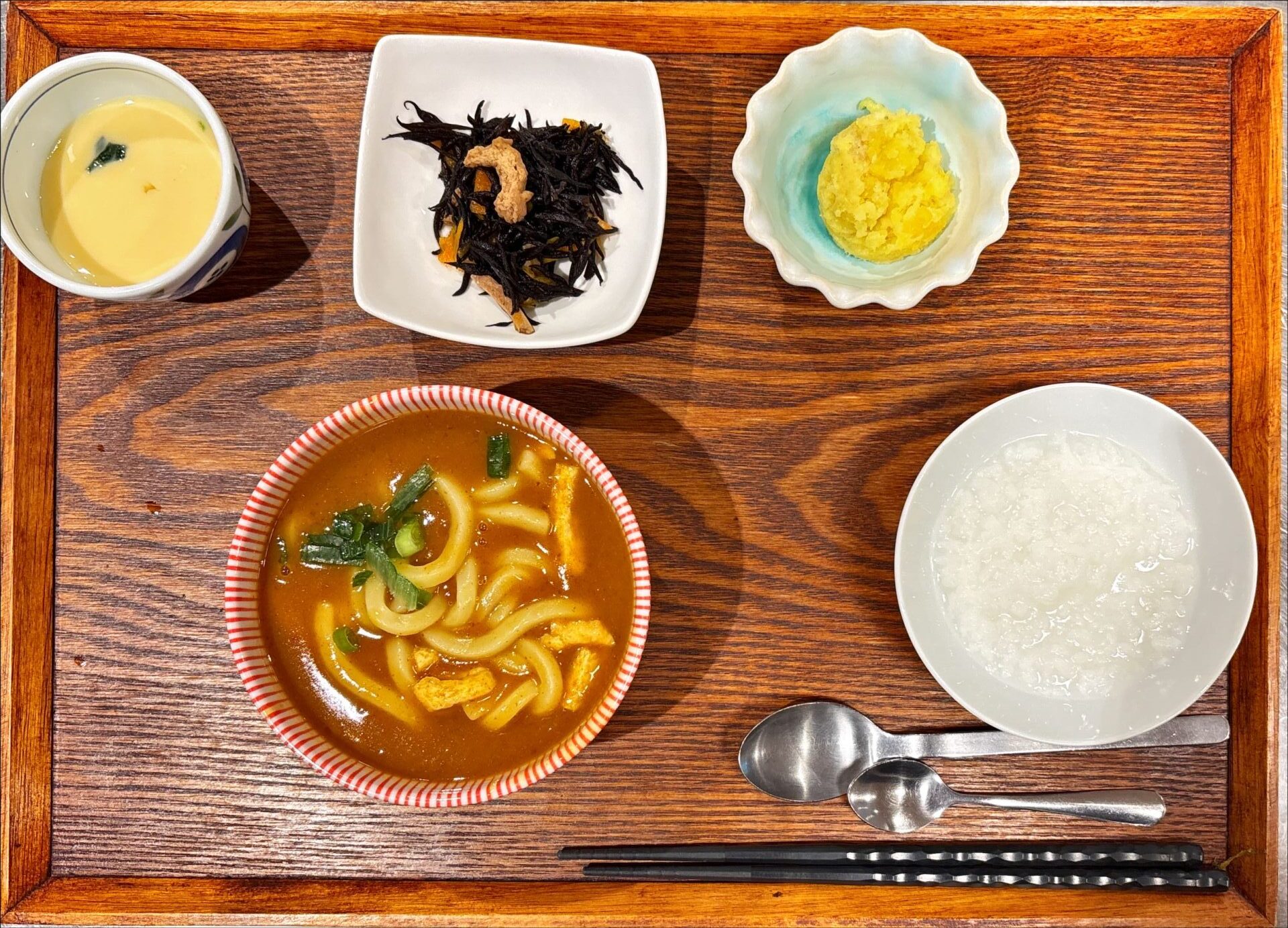 本日の麺定食は、『カレーうどん(そばにも変更可能です)』。 付け合わせは、おにぎり・ひじき煮・丸十サラダ・茶碗蒸しです。