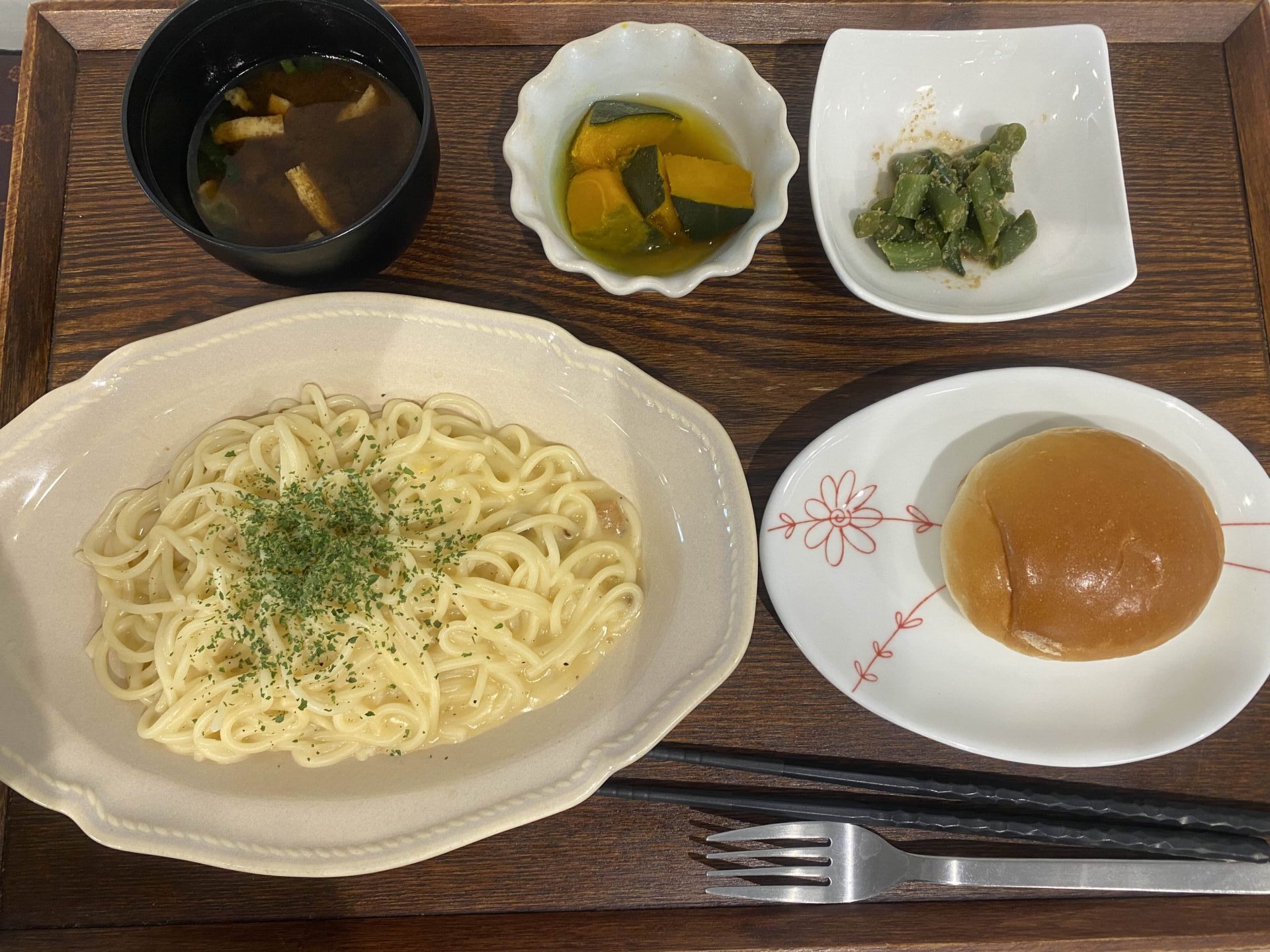 付け合わせ、パン(ごはんにも変更可能です)南瓜の煮物・いんげんの生姜醬油和え・味噌汁です。
