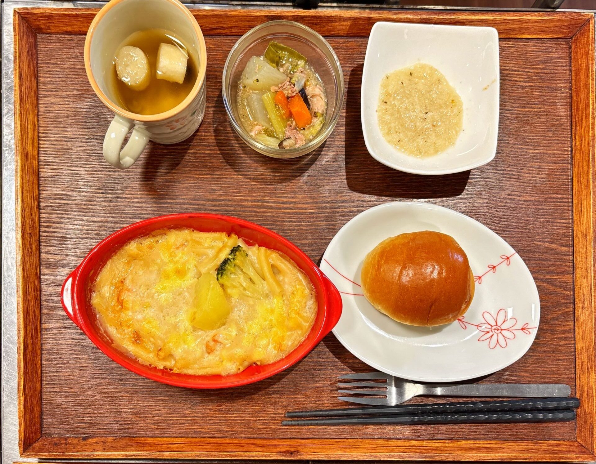 付け合わせ、パン(ごはんにも変更可能です)大根と海老のとろみ煮・長芋の梅肉和え・すまし汁です。