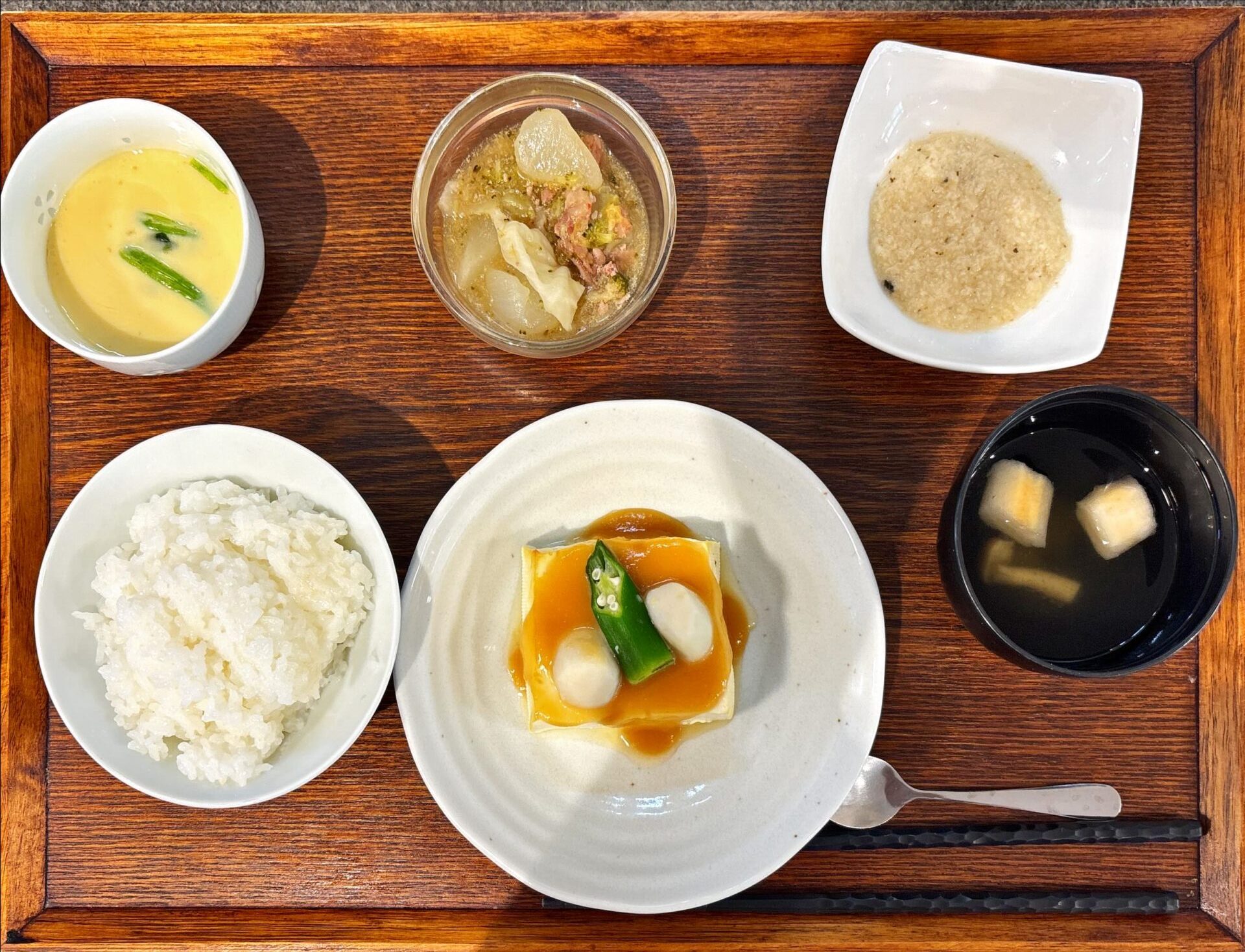 付け合わせは、ごはん・大根と海老のとろみ煮・長芋の梅肉和え・すまし汁・茶碗蒸しです。