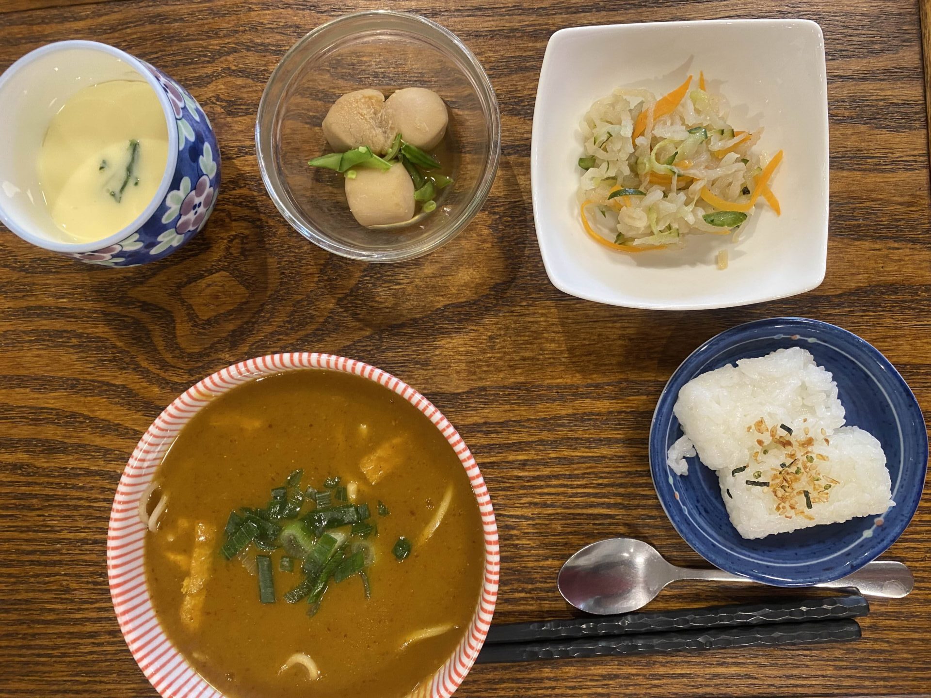 付け合わせは、おにぎり・里芋の煮っ転がし・切り干し大根サラダ・茶碗蒸しです。