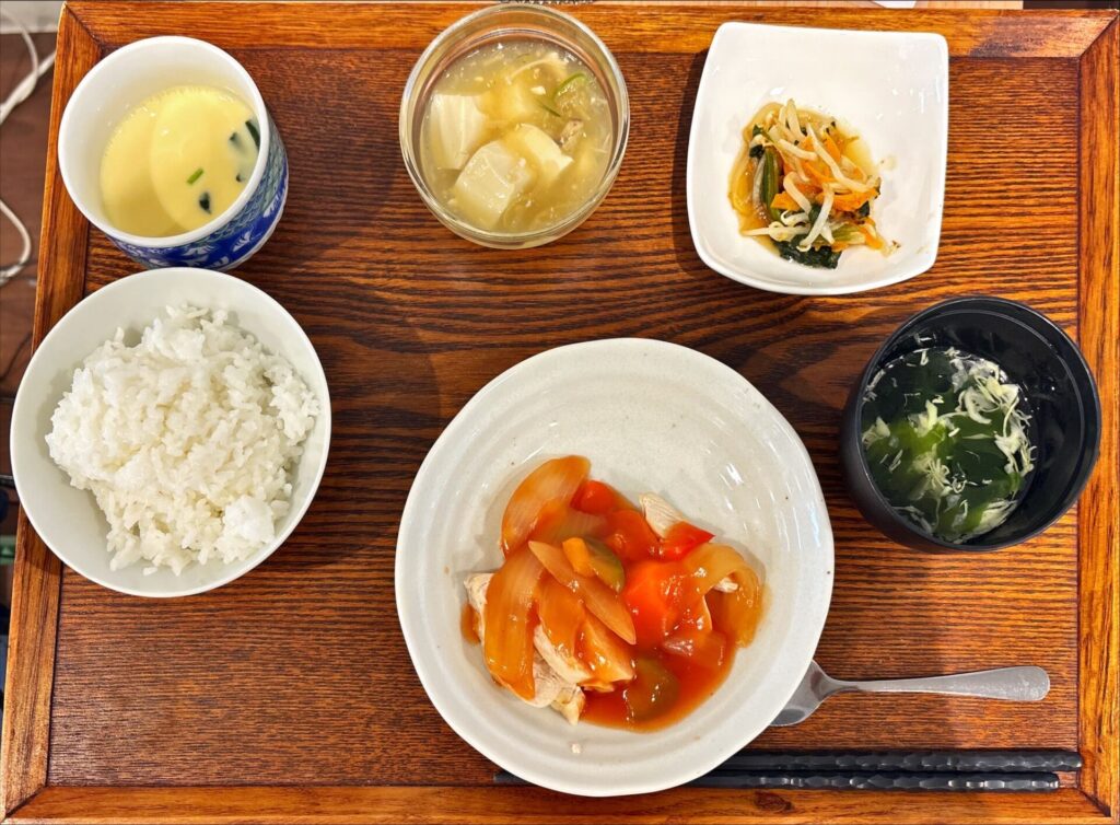 本日の日替わりは、『鶏のチリソース』です。 付け合わせは、ごはん・豆腐のきのこあん・もやしのナムル・中華スープ・茶碗蒸しです。