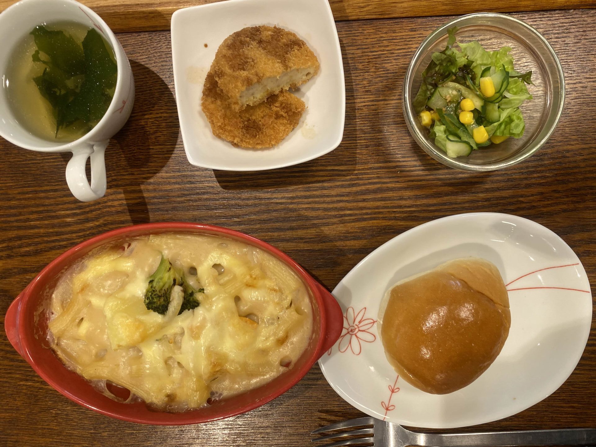 付け合わせ、パン(ごはんにも変更可能です)コロッケ・和風仕立てのサラダ・コンソメスープです。