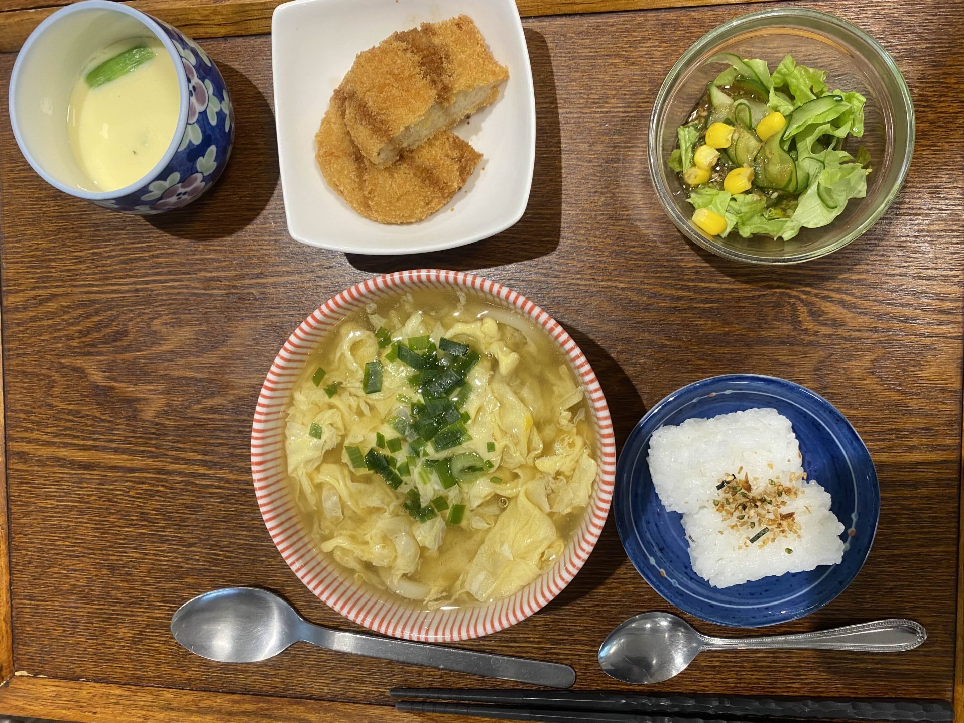 付け合わせは、ごはん・コロッケ・和風仕立てのサラダ・コンソメスープ・茶碗蒸しです。