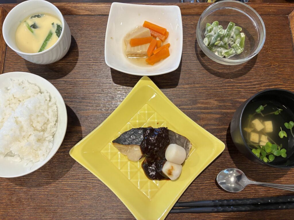 付け合わせは、たけのこの煮付け・いんげんの胡麻和え・すまし汁・ごはん・茶碗蒸しです。