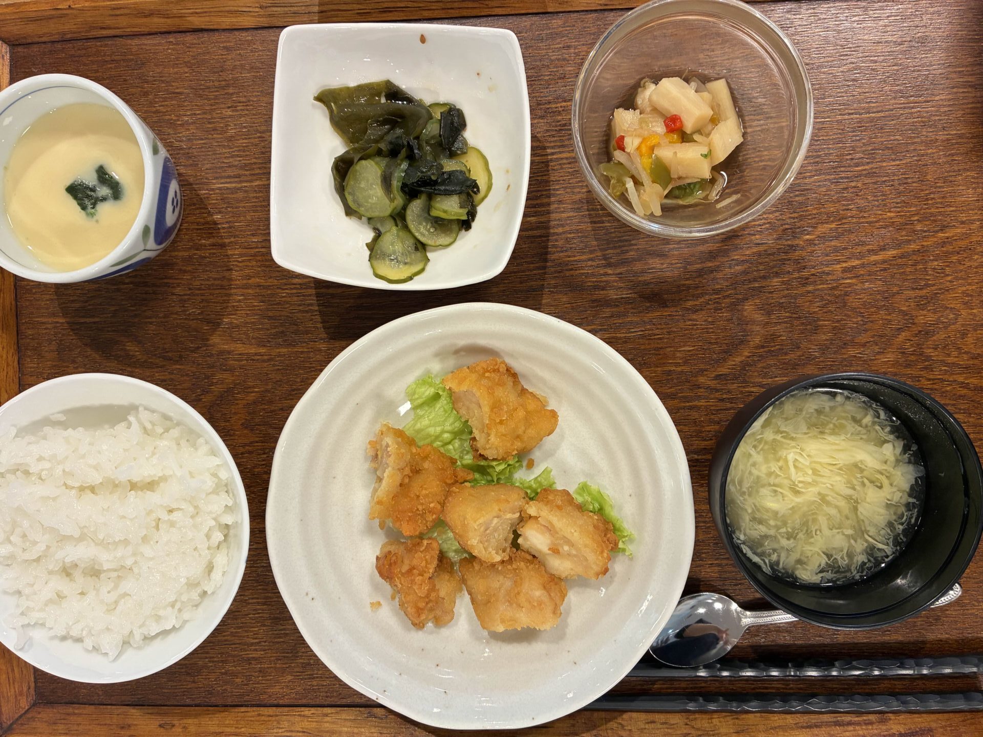 付け合わせは、ごはん・ピーマンのオイスター炒め・胡瓜とハムの中華サラダ・中華スープ・茶碗蒸しです。