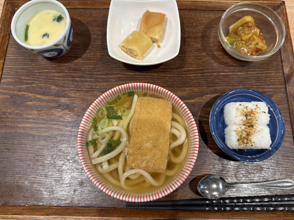 本日の麺定食は、『きつねうどん(そばにも変更可能です)』。 付け合わせは、おにぎり・春巻き・レンコンサラダ・茶碗蒸しです。