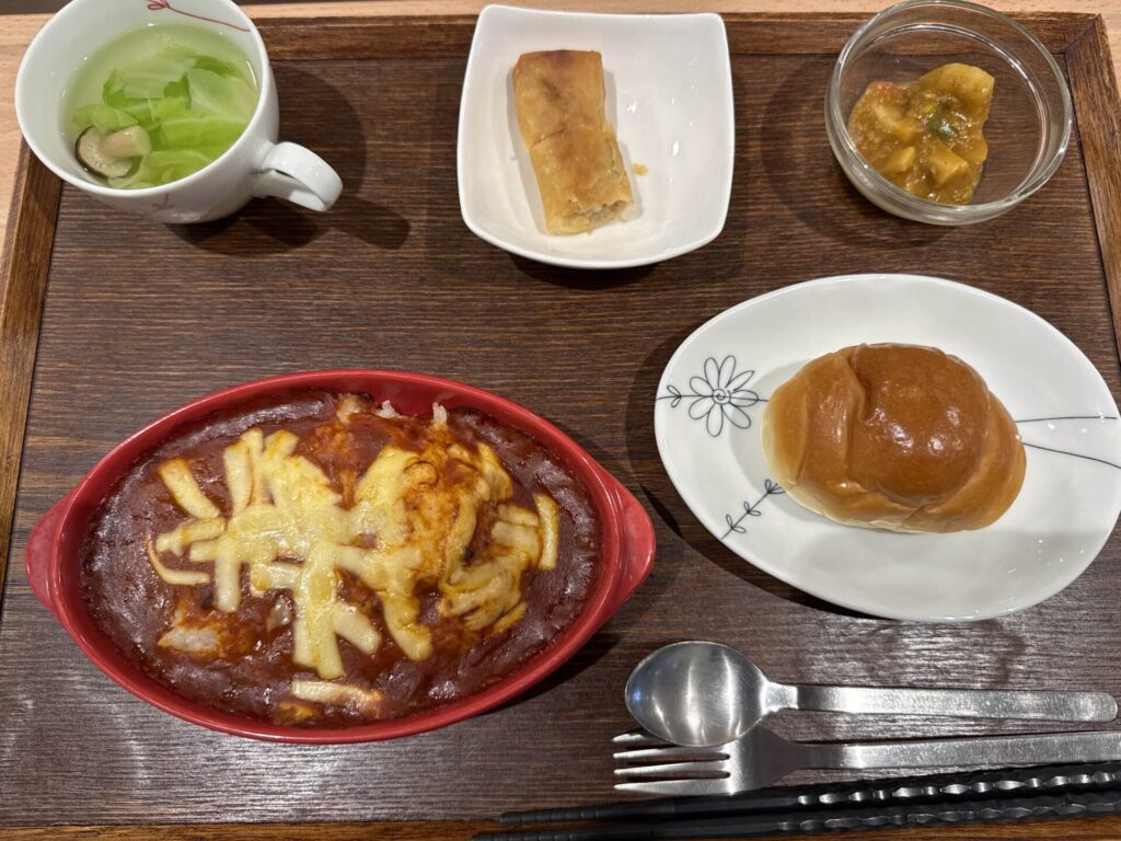 本日のパスタランチは、『チーズミートドリア』 付け合わせ、パン(ごはんにも変更可能です)・春巻き・レンコンサラダ・中華スープです。