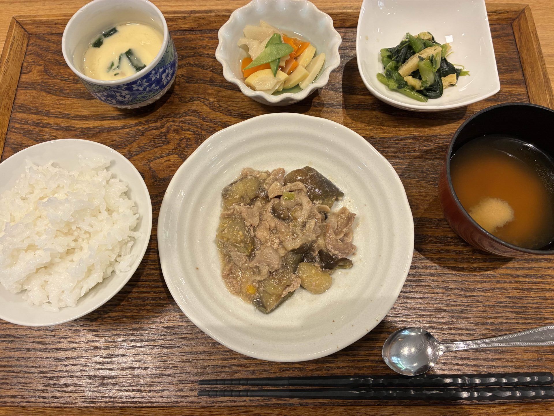 付け合わせは、ごはん・たけのこの煮付け・小松菜と油揚げのお浸し・味噌汁・茶碗蒸しです。