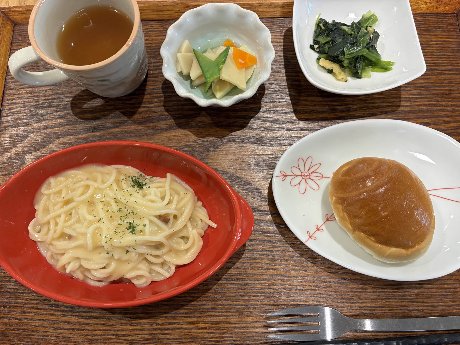 付け合わせ、パン(ごはんにも変更可能です)たけのこの煮付け・小松菜と油揚げのお浸し・味噌汁です。