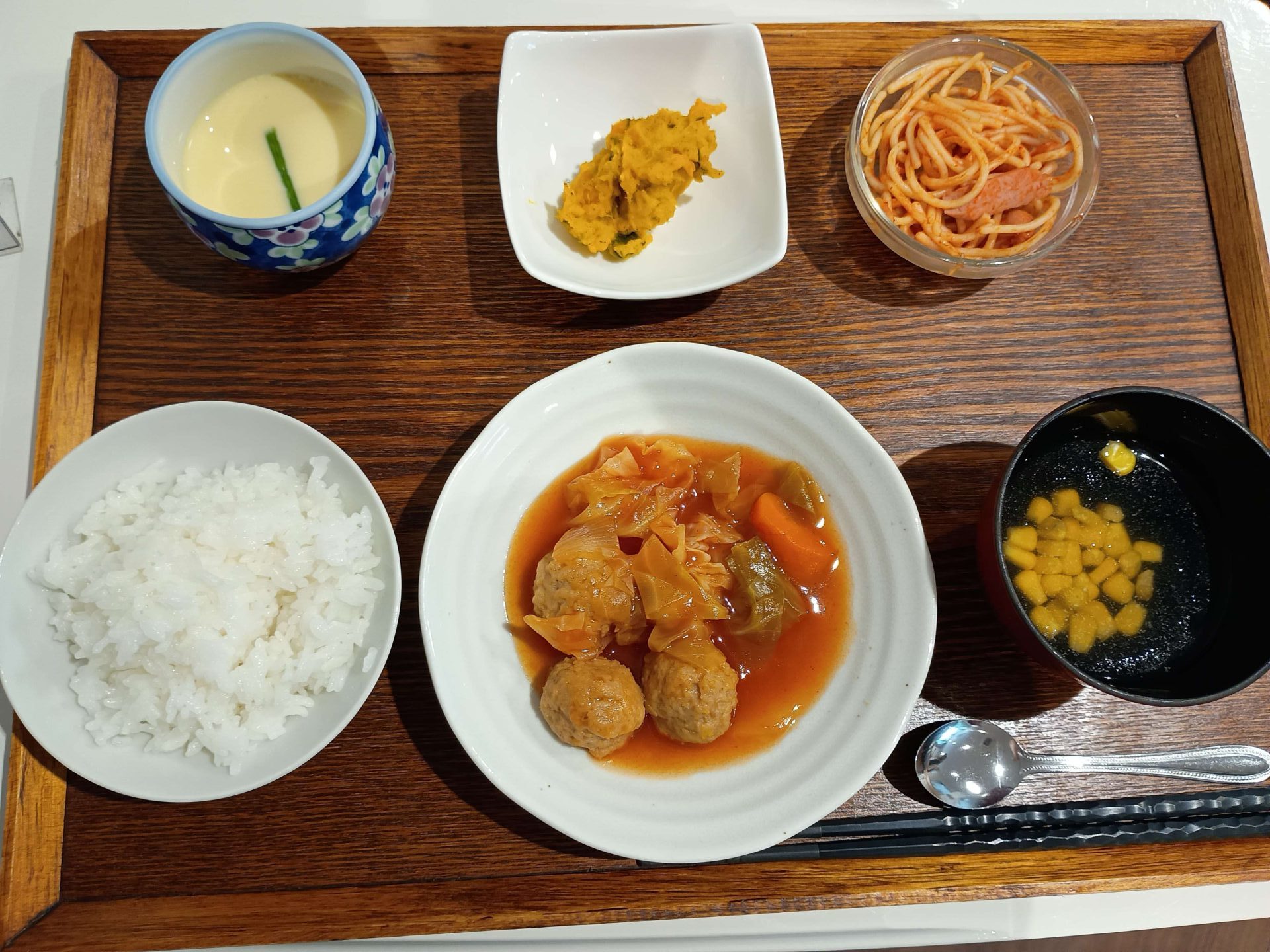付け合わせは、ごはん・まろやかナポリタン・かぼちゃサラダ・コンソメスープ・茶碗蒸しです。