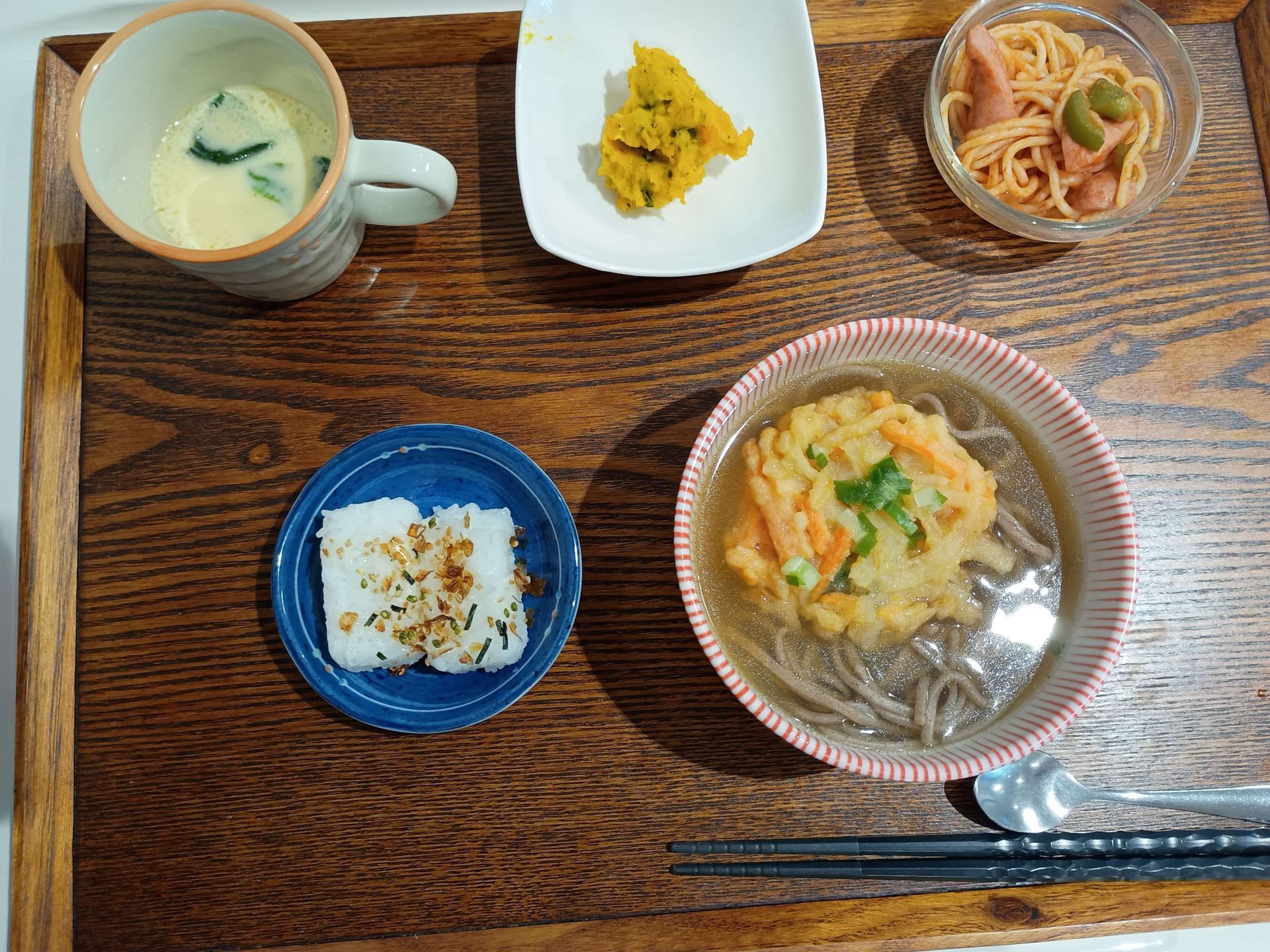 付け合わせは、おにぎり・まろやかナポリタン・かぼちゃサラダ・茶碗蒸しです。