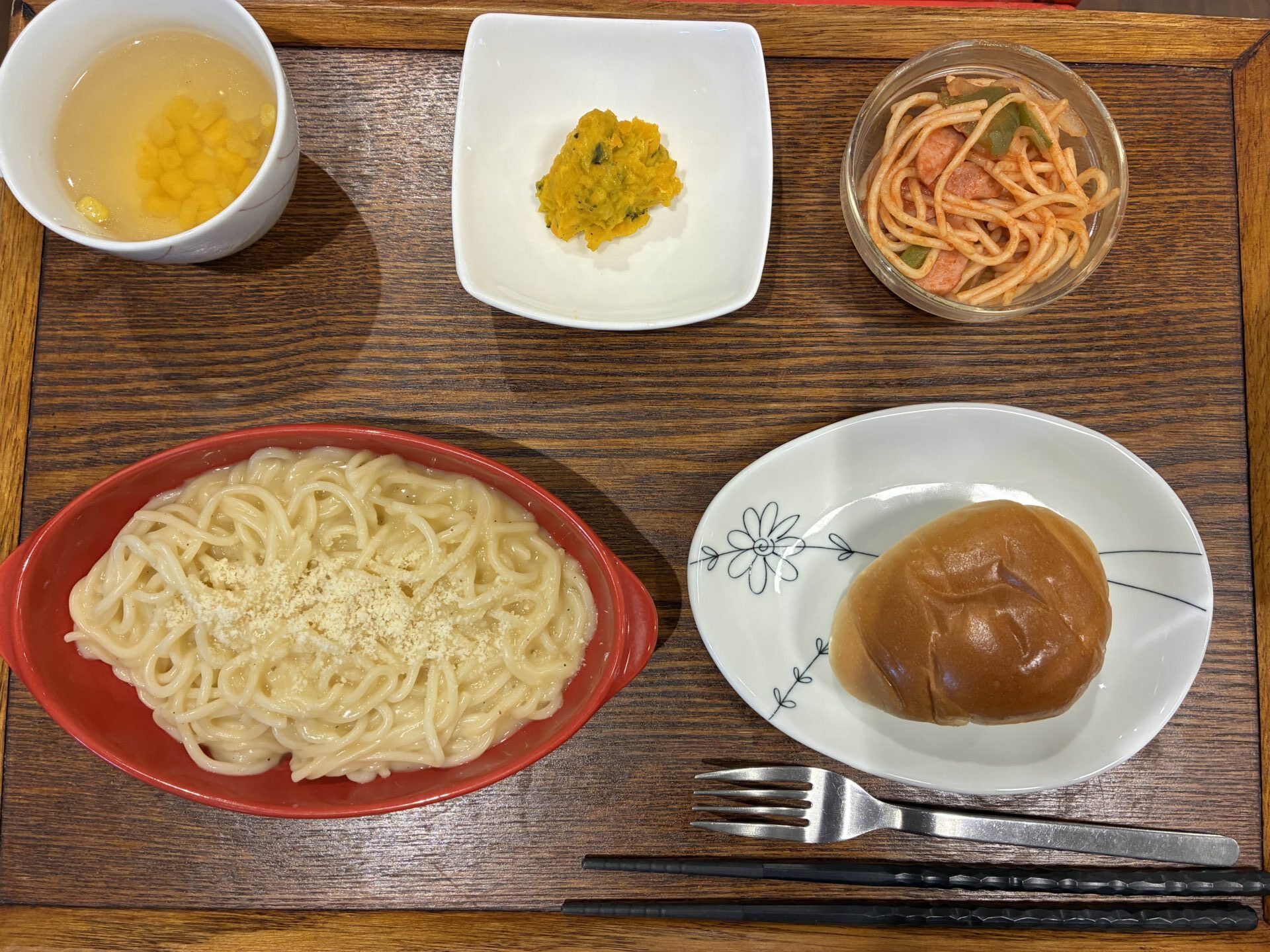 付け合わせ、パン(ごはんにも変更可能です)まろやかナポリタン・かぼちゃサラダ・コンソメスープです。