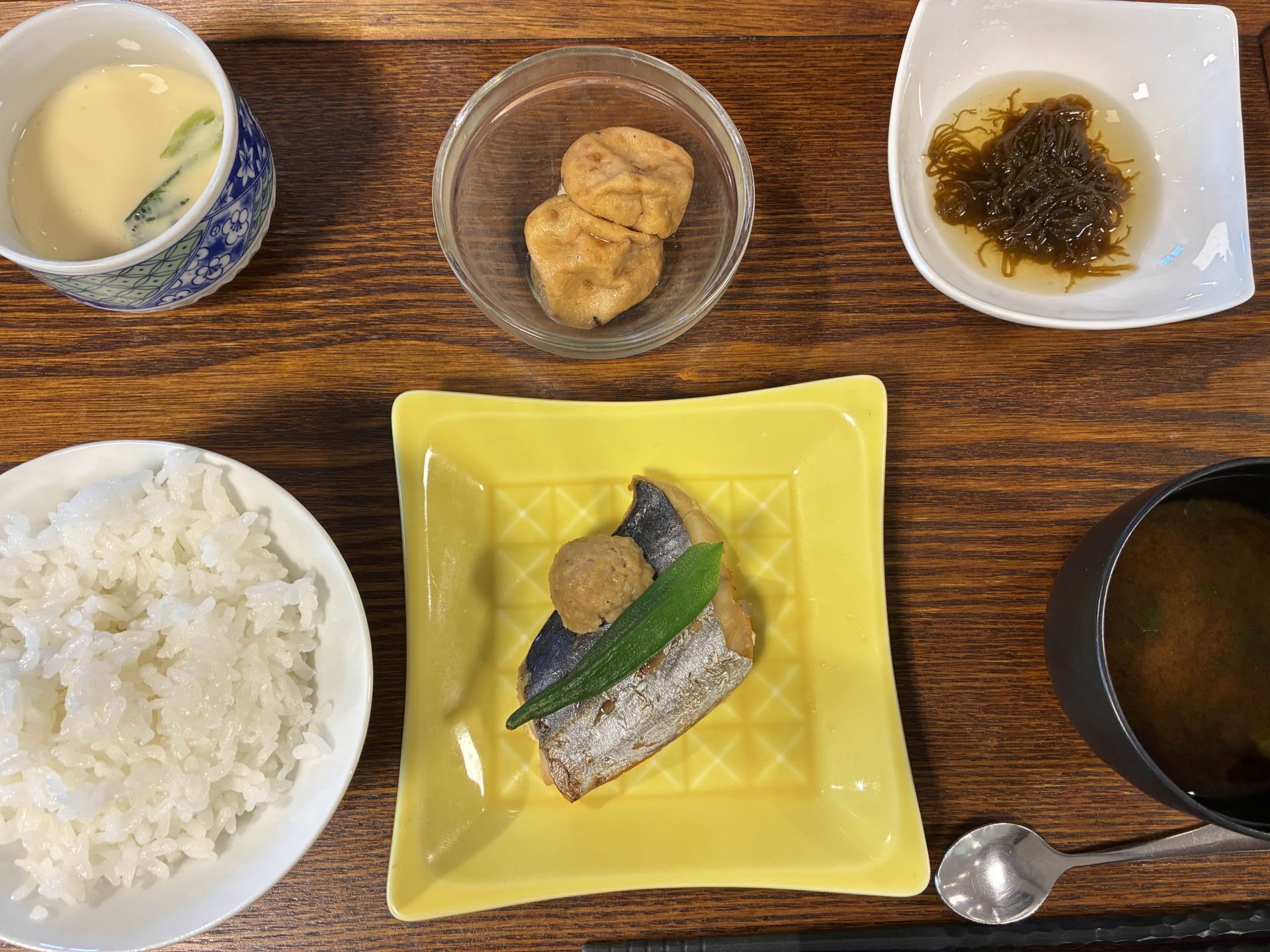 付け合わせは、ごはん・がんも煮・もずく酢・味噌汁・茶碗蒸しです。