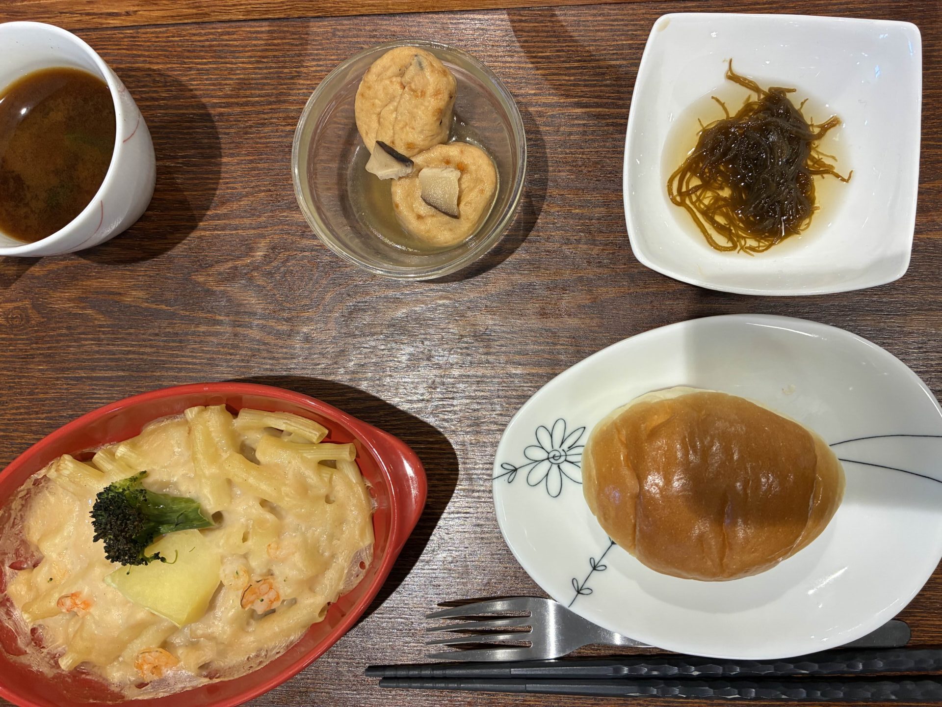 付け合わせ、パン(ごはんにも変更可能です)がんも煮・もずく酢・味噌汁です。