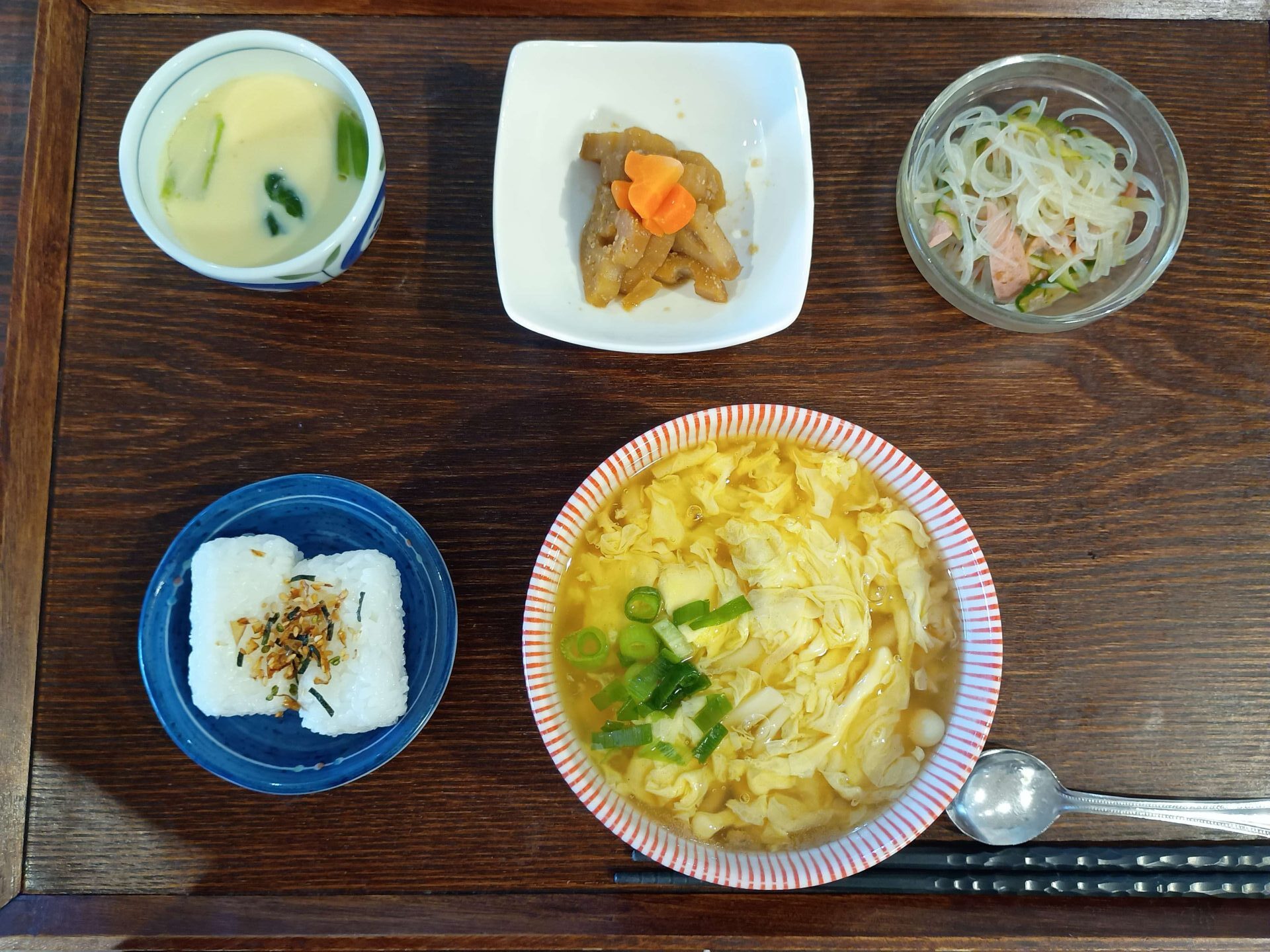 付け合わせは、おにぎり・レンコン炒め・春雨の中華和え・茶碗蒸しです。