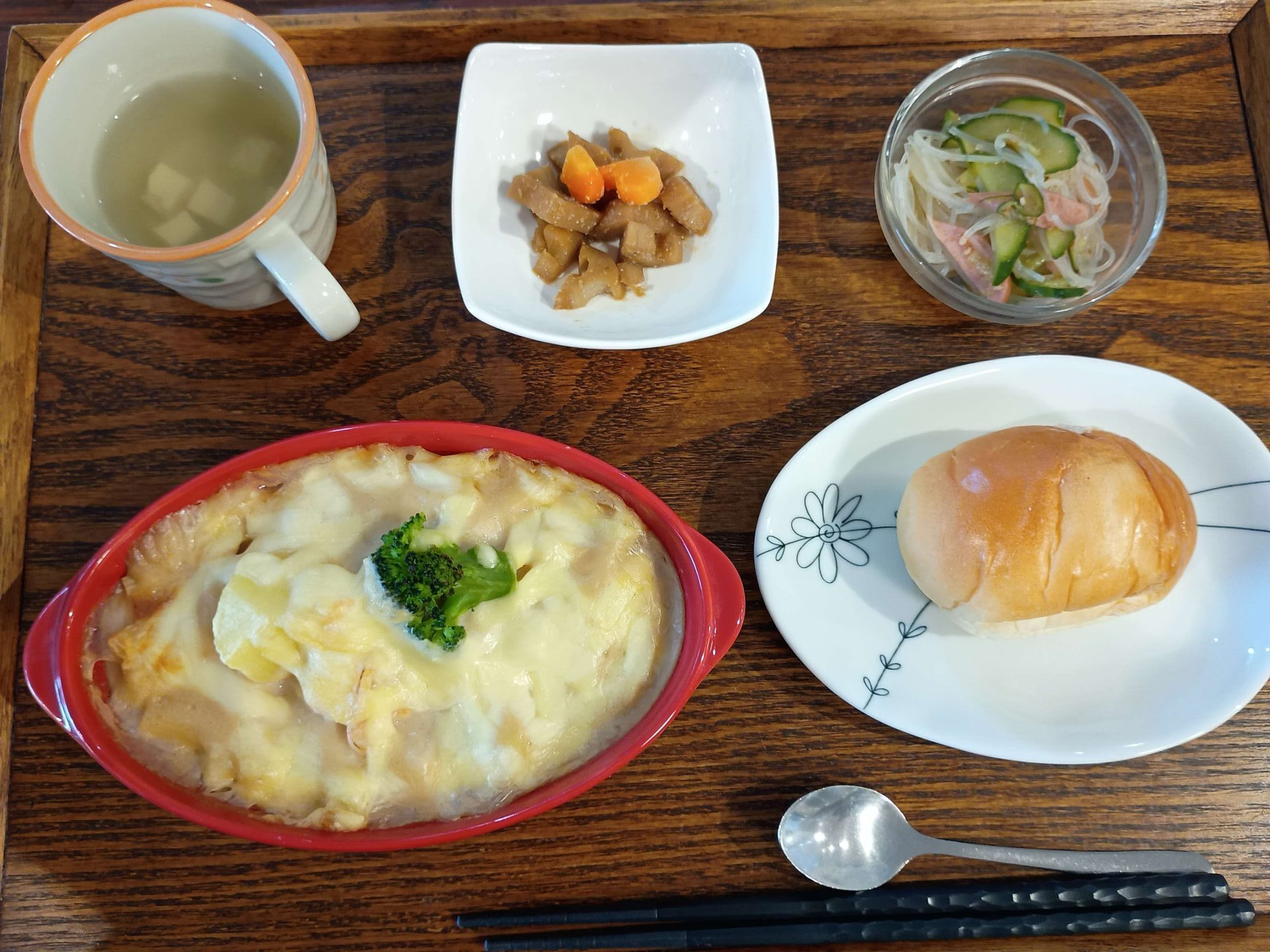 付け合わせ、パン(ごはんにも変更可能です)レンコン炒め・春雨の中華和え・中華スープです。