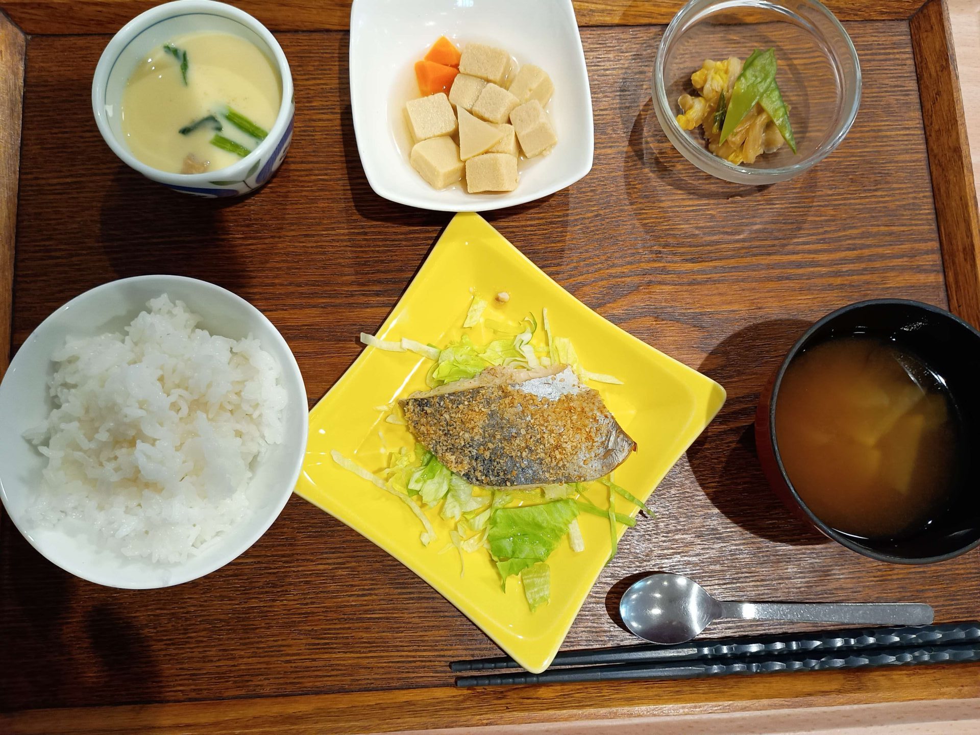 付け合わせは、ごはん・高野豆腐煮・白菜のさっぱり和え・味噌汁・茶碗蒸しです。