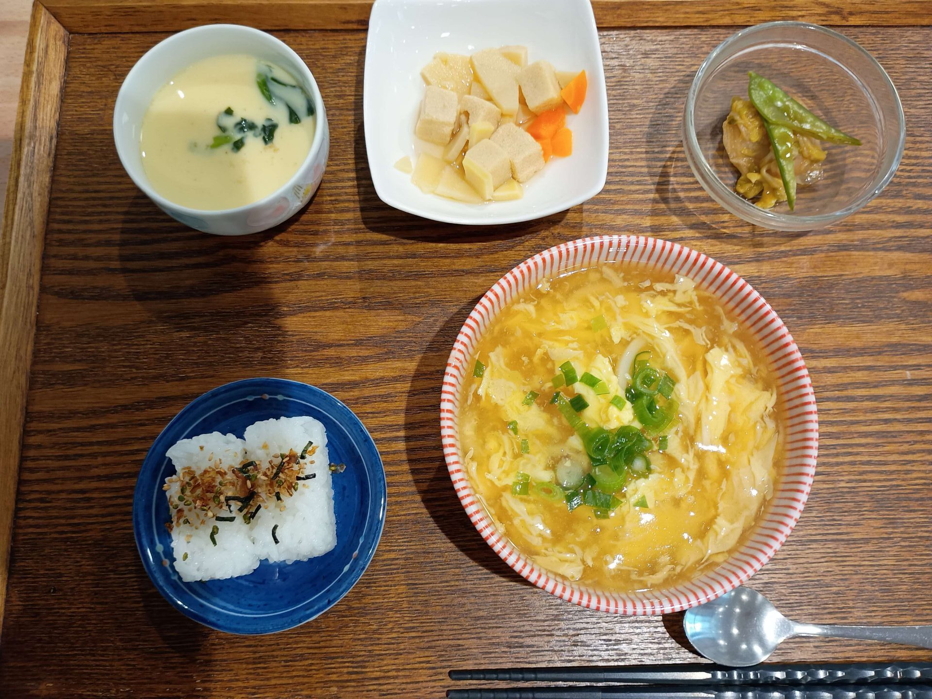 付け合わせは、おにぎり・高野豆腐煮・白菜のさっぱり和え・茶碗蒸しです。