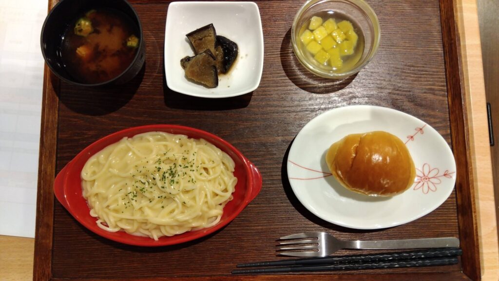 付け合わせ、パン(ごはんにも変更可能です)さつまいもの甘煮・茄子のごまよごし・味噌汁です。
