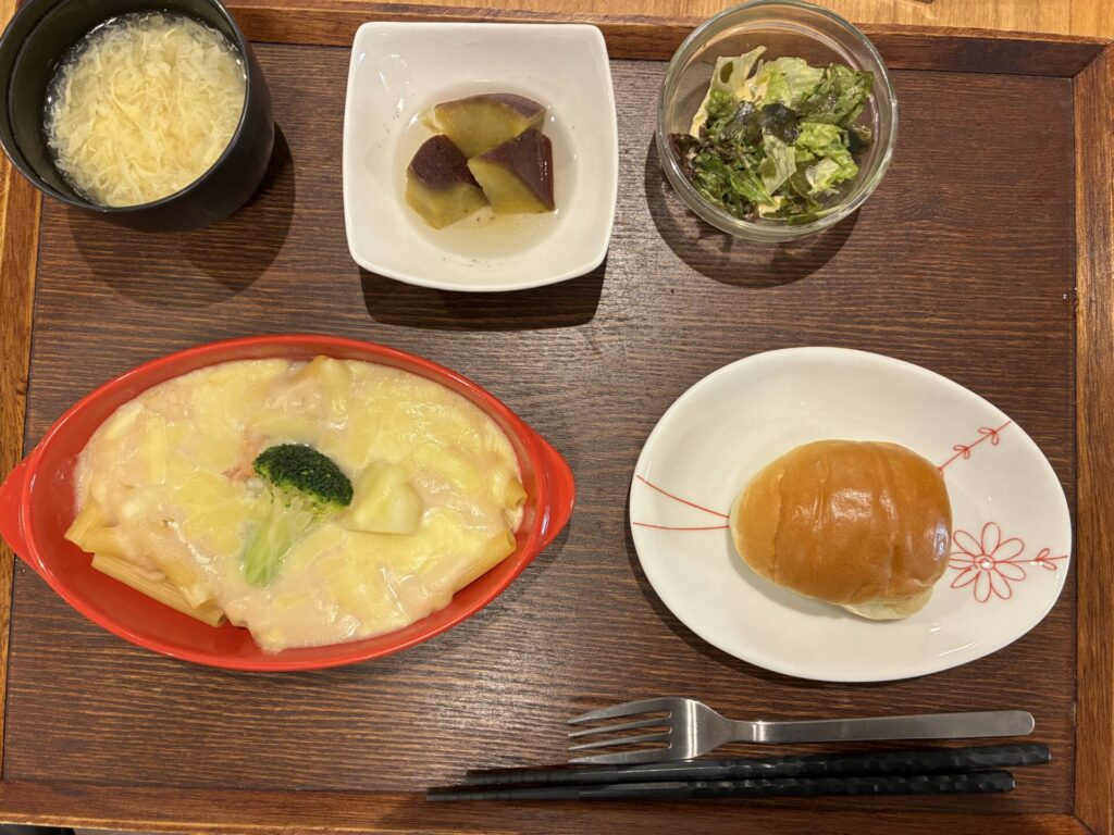 付け合わせ、パン(ごはんにも変更可能です)大学芋煮・海藻サラダ・コンソメスープです。