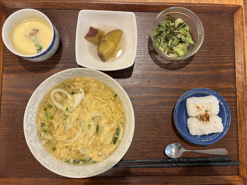 付け合わせは、おにぎり大学芋煮・海藻サラダ・茶碗蒸しです。