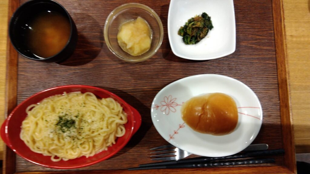 付け合わせ、じゃがいもの金平・小松菜おかか和え・味噌汁・パン(ごはんにも変更可能です)です。