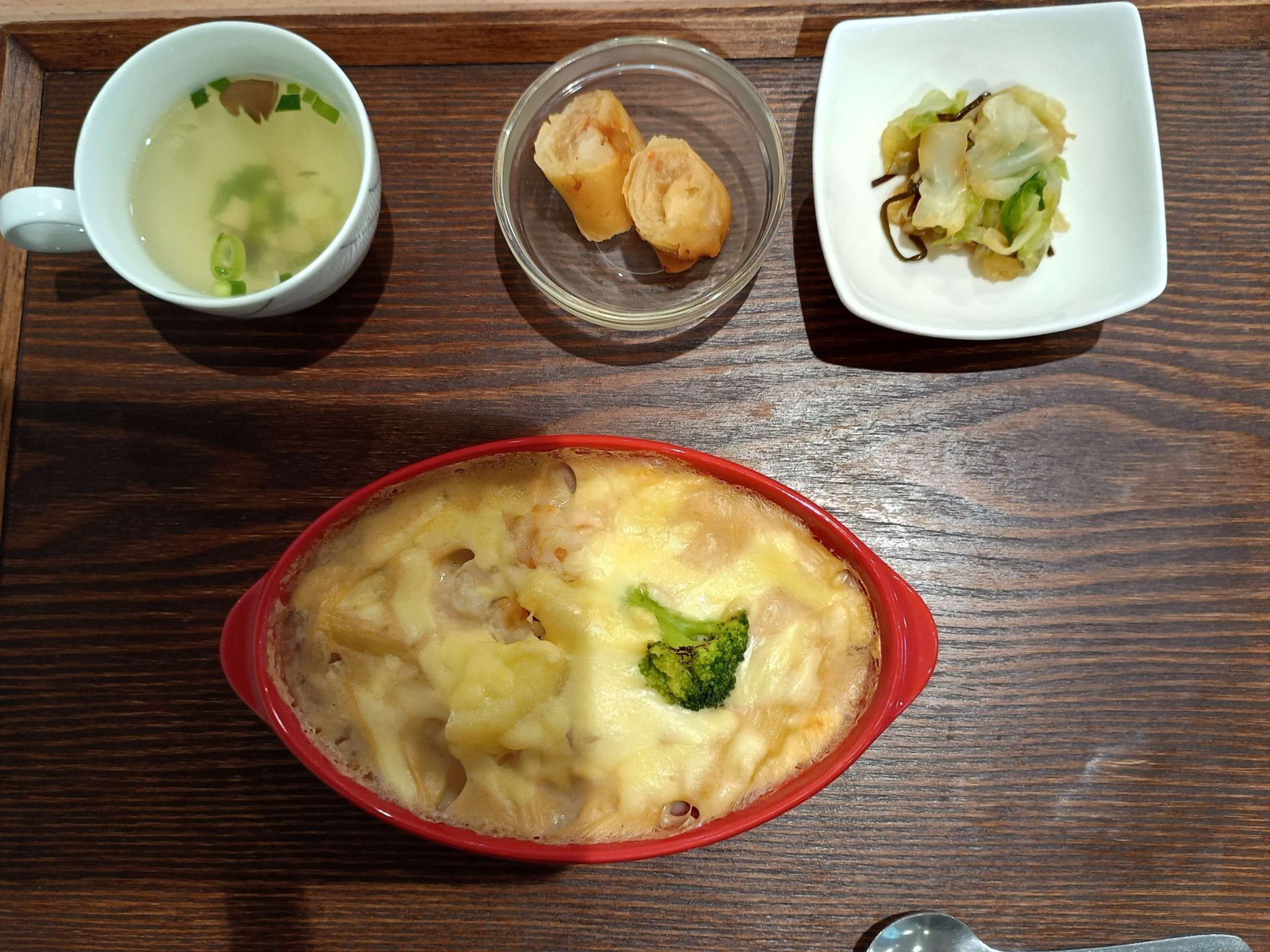 付け合わせは、おにぎり・春巻き・キャベツの塩昆布和え・茶碗蒸しです。