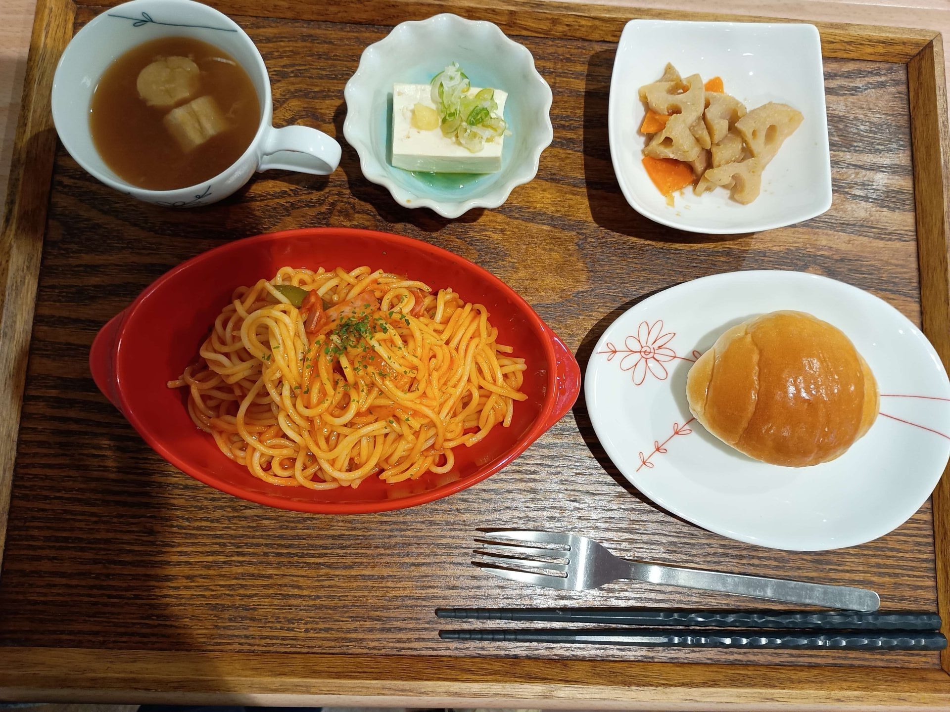 付け合わせ、パン(ごはんにも変更可能です)きんぴらレンコン・冷ぬ・味噌汁です。