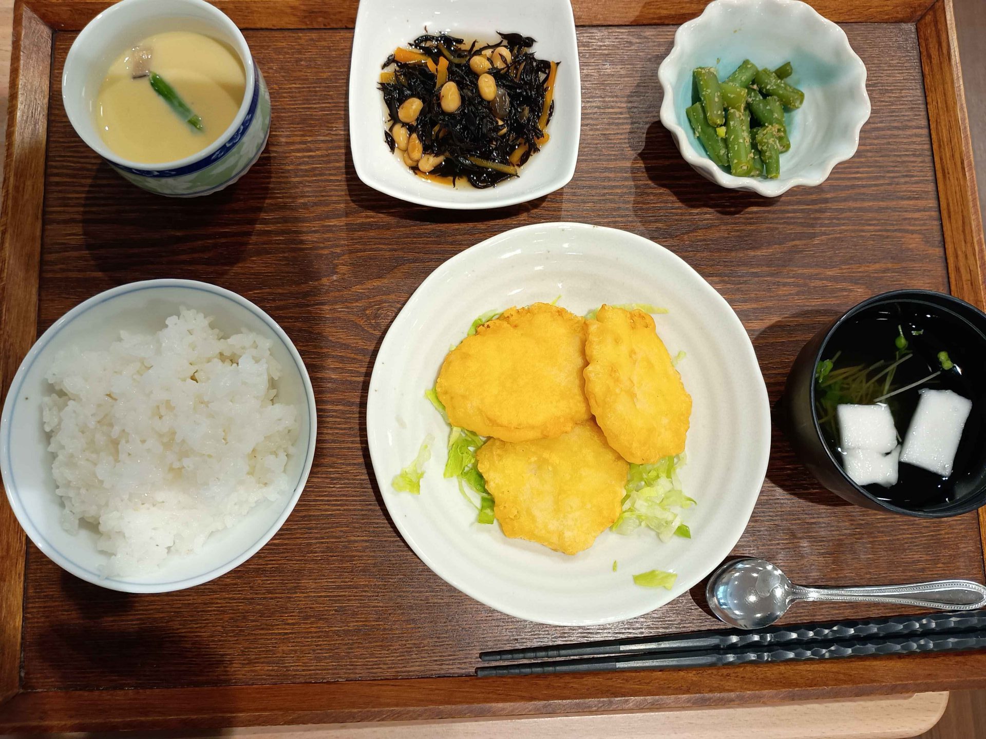 付け合わせは、ごはん・ひじき豆煮・いんげんのごま和え・すまし汁・茶碗蒸しです。