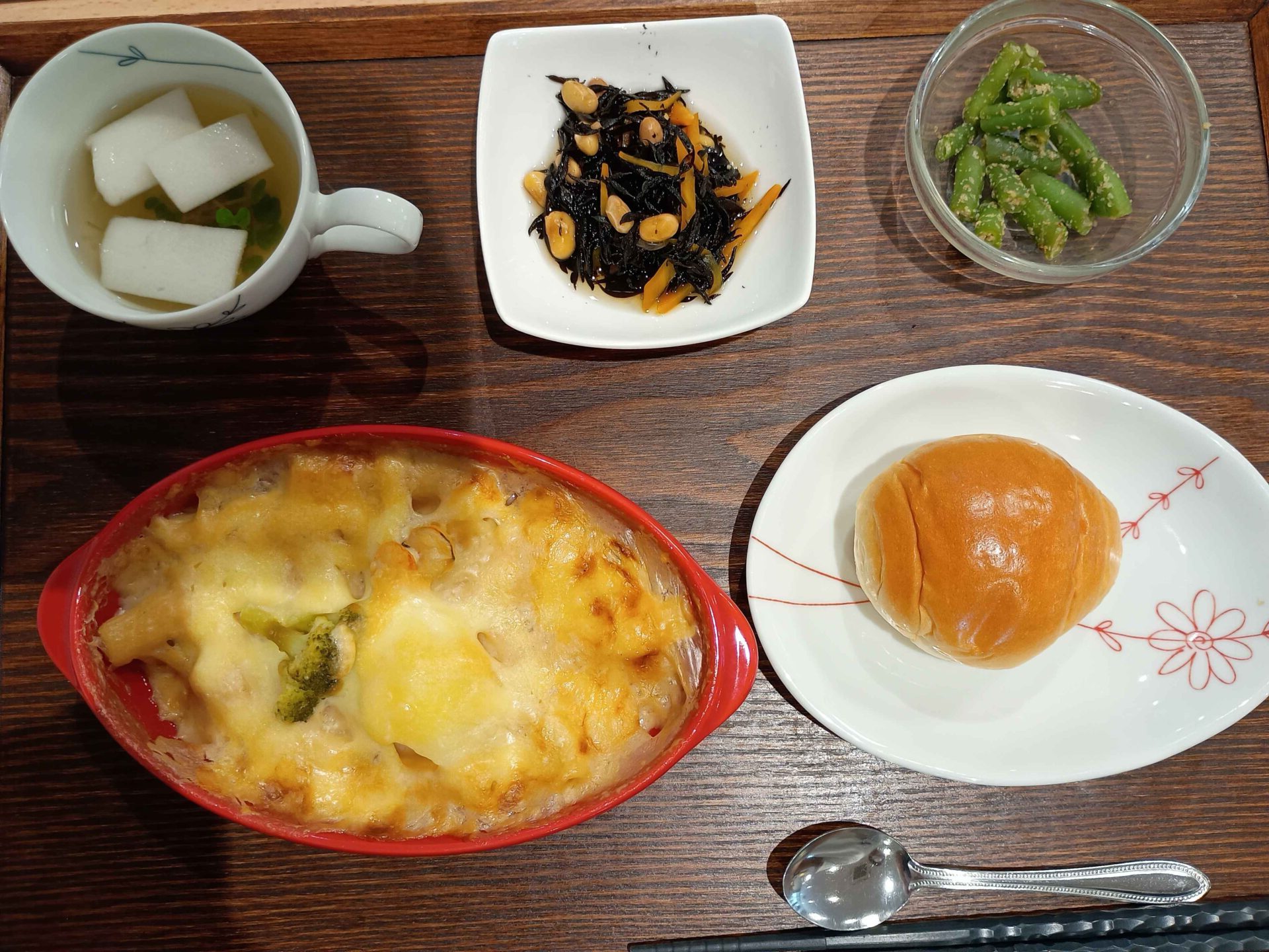 付け合わせ、パン(ごはんにも変更可能です)・ひじき豆煮・いんげんのごま和え・すまし汁です。