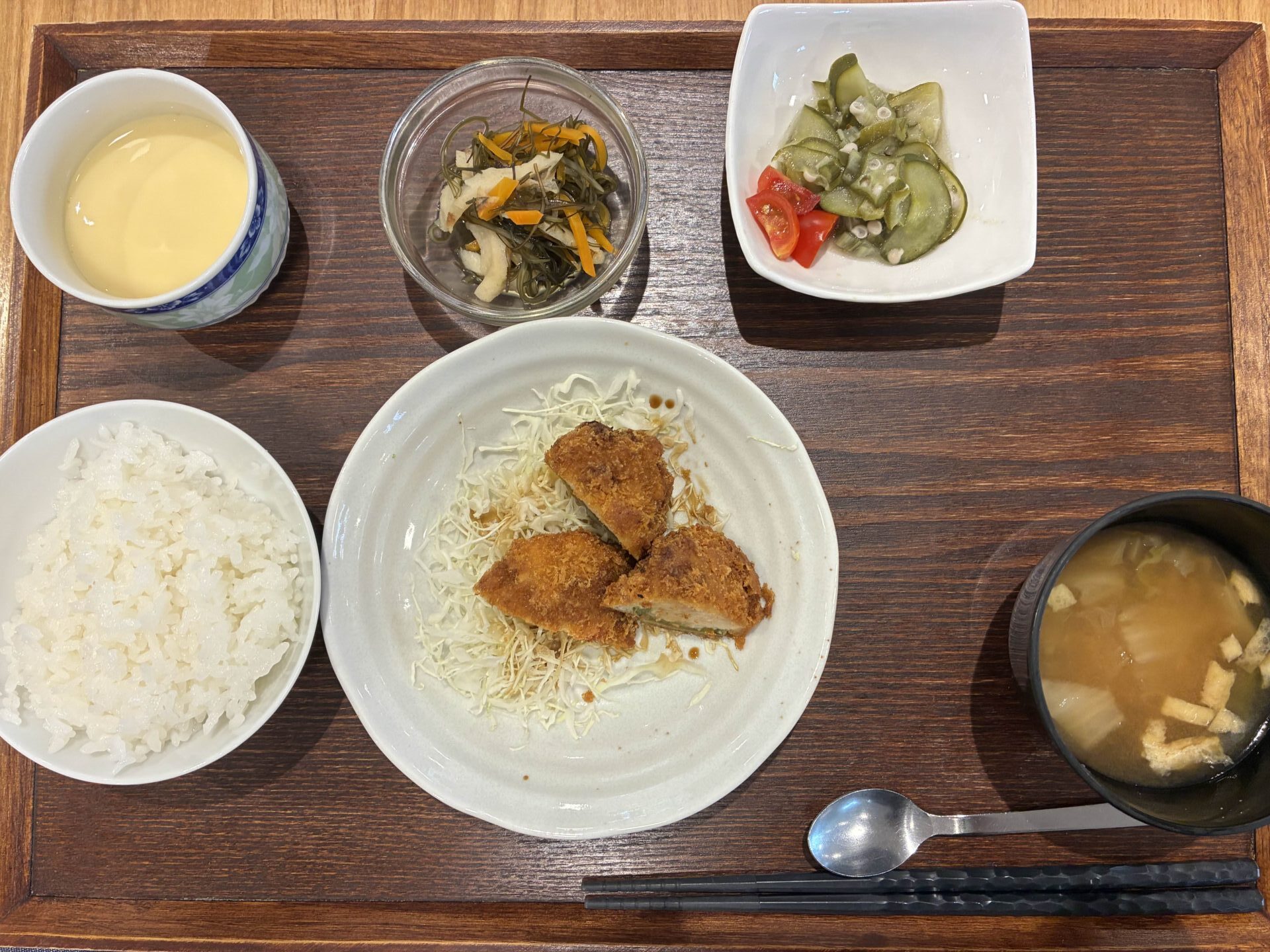 付け合わせは、ごはん・糸昆布煮・オクラとトマトのサラダ・味噌汁・茶碗蒸しです。