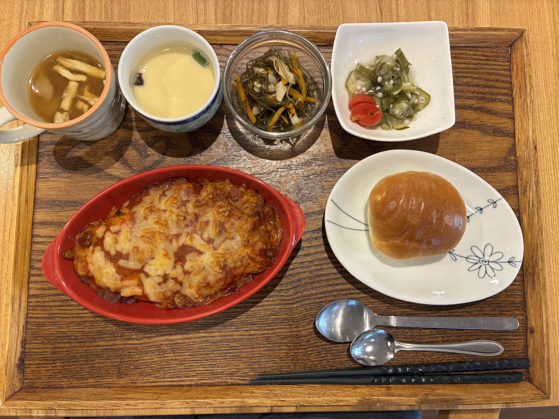 付け合わせ、パン(ごはんにも変更可能です)糸昆布煮・オクラとトマトのサラダ・味噌汁です。