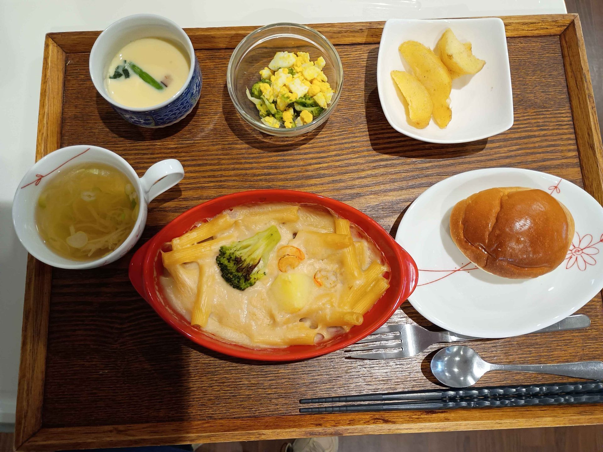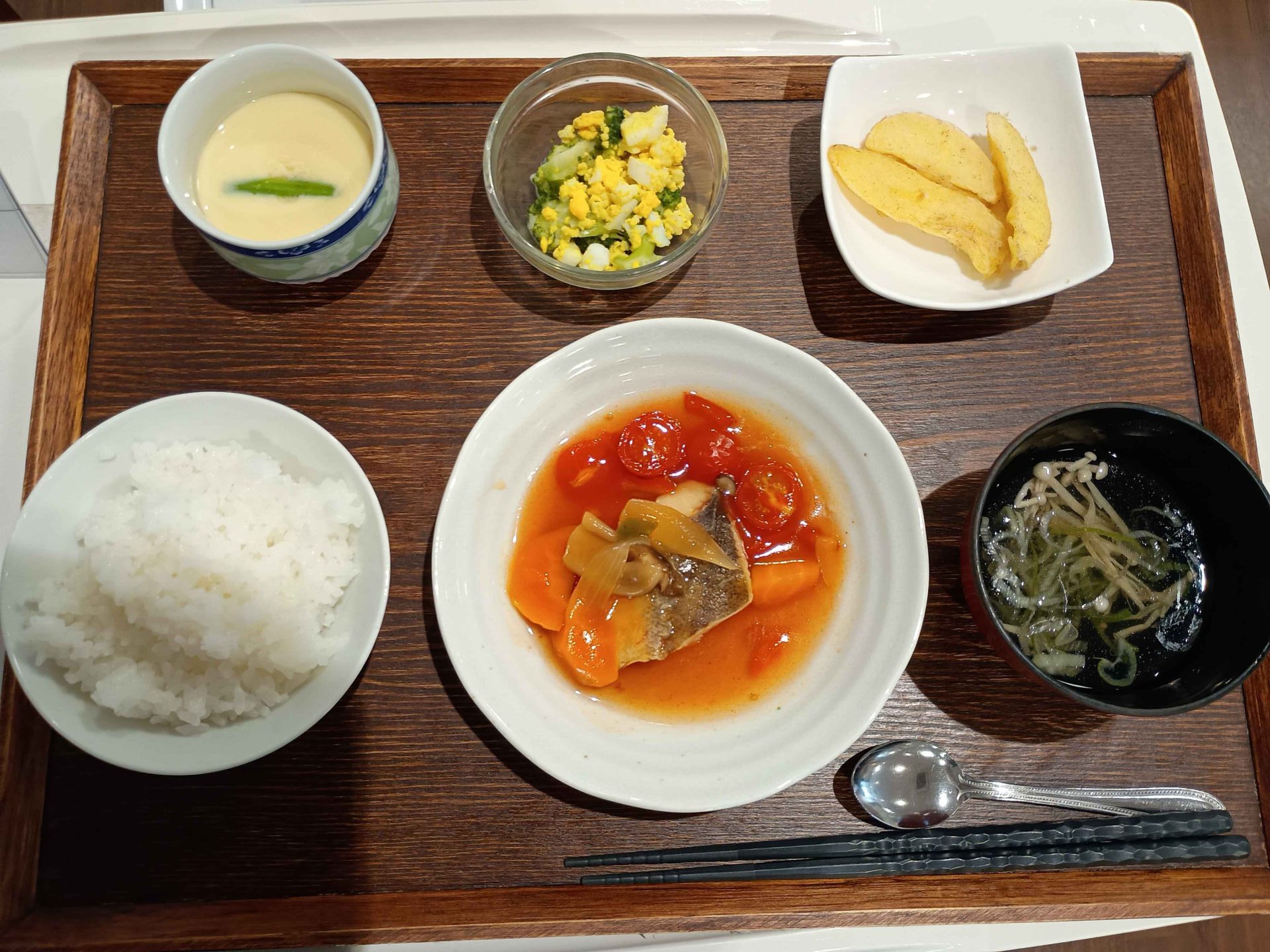 付け合わせは、ごはん・ジャーマンポテト・ミモザサラダ・コンソメスープ・茶碗蒸しです。