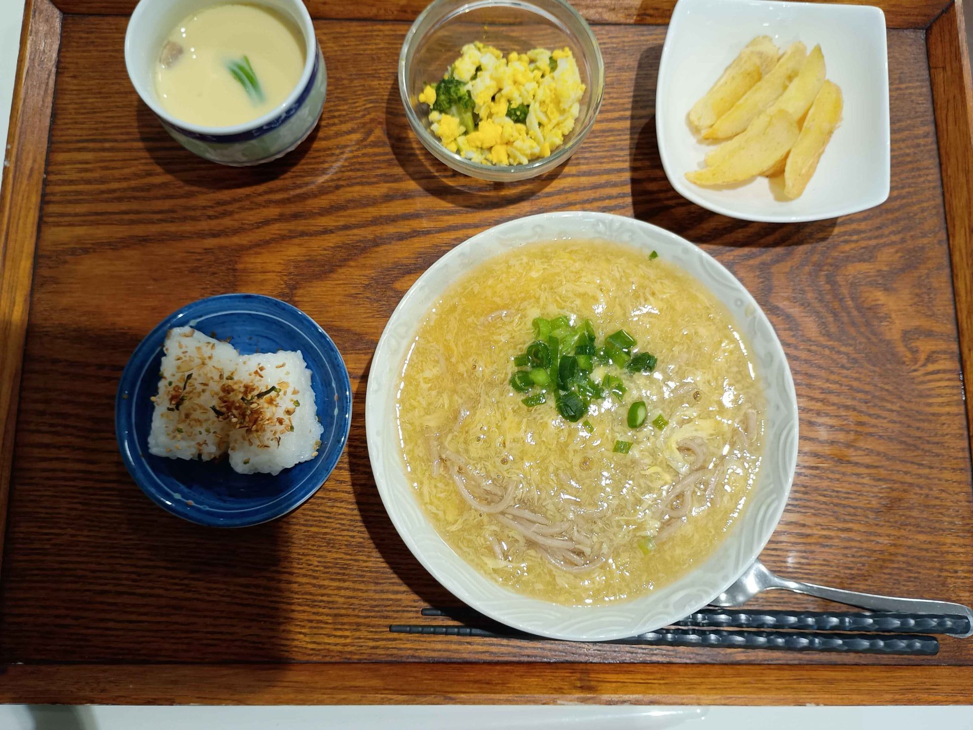 付け合わせは、おにぎり・ジャーマンポテト・ミモザサラダ・茶碗蒸しです。