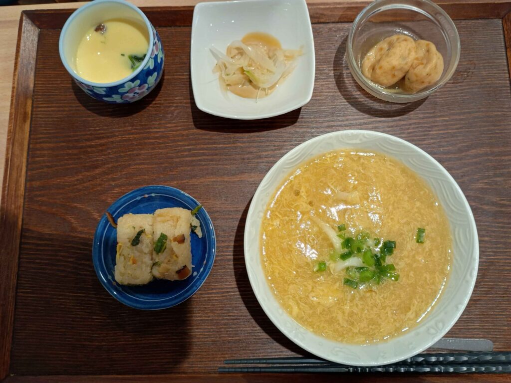 付け合わせは、おにぎり・がんも煮・玉ねぎマヨポン・すまし汁・茶碗蒸しです。