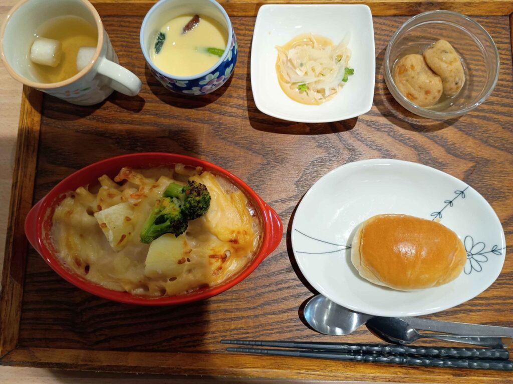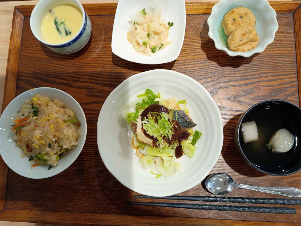 付け合わせは、ごはん・がんも煮・玉ねぎマヨポン和え・すまし汁・茶碗蒸しです。