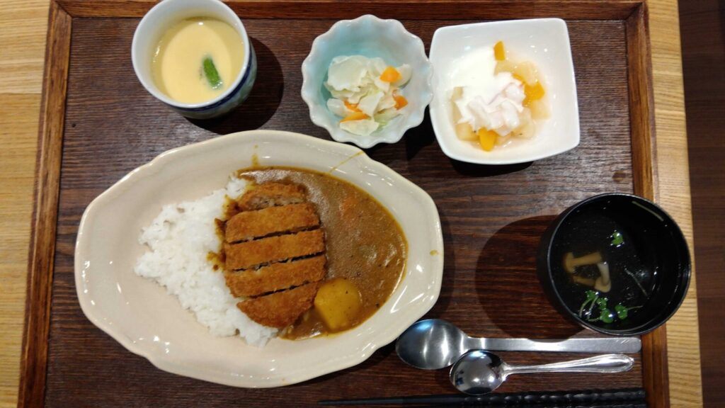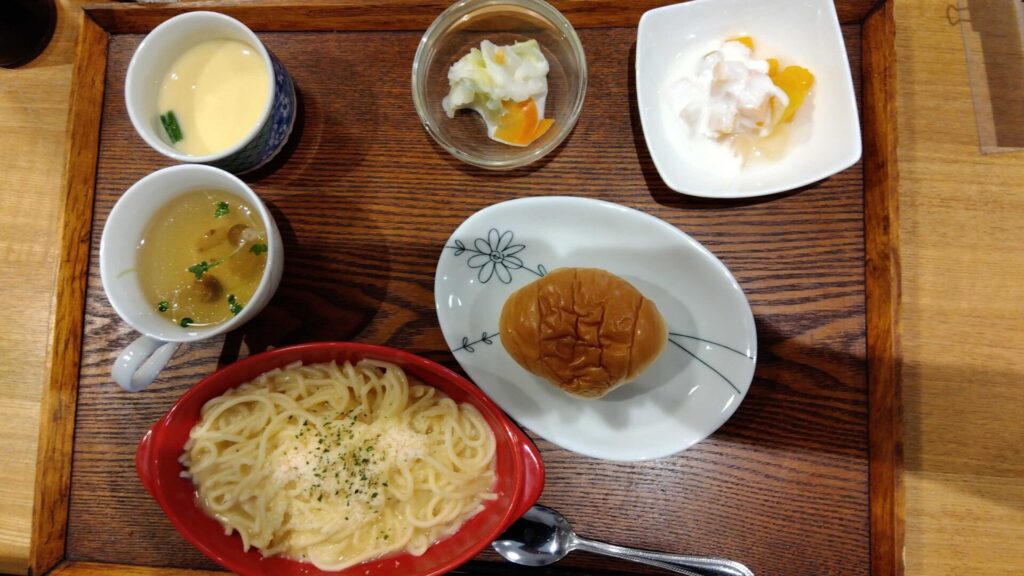 付け合わせは、おにぎり・フルーツヨーグルト和え・コールスロー・茶碗蒸しです。