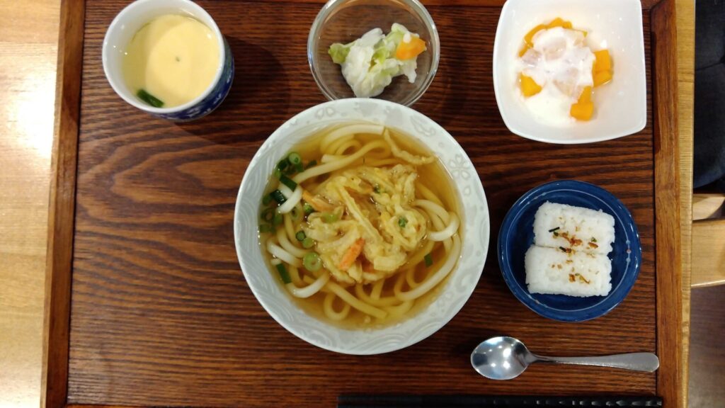本日の麺定食は、『かき揚げうどん(そばにも変更可能です)』。