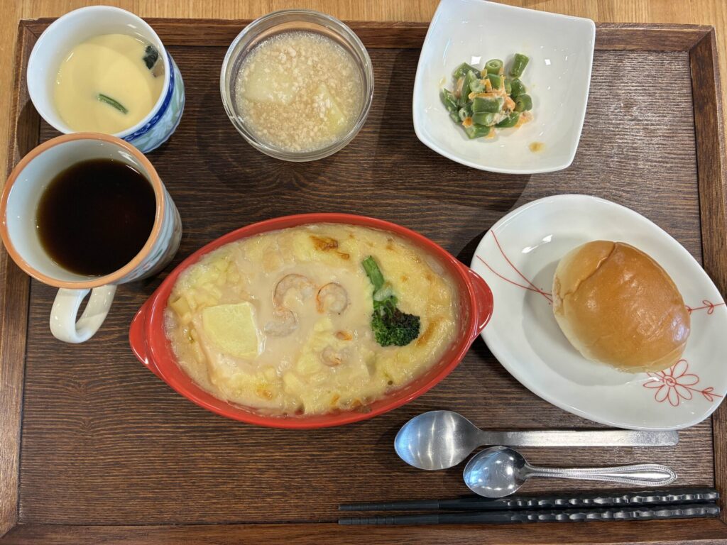 本日のパスタランチは、『えびマカロニグラタン』です。