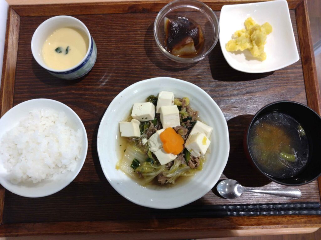 付け合わせは、ごはん・ふろふき大根・丸十サラダ・すまし汁・茶碗蒸しです。