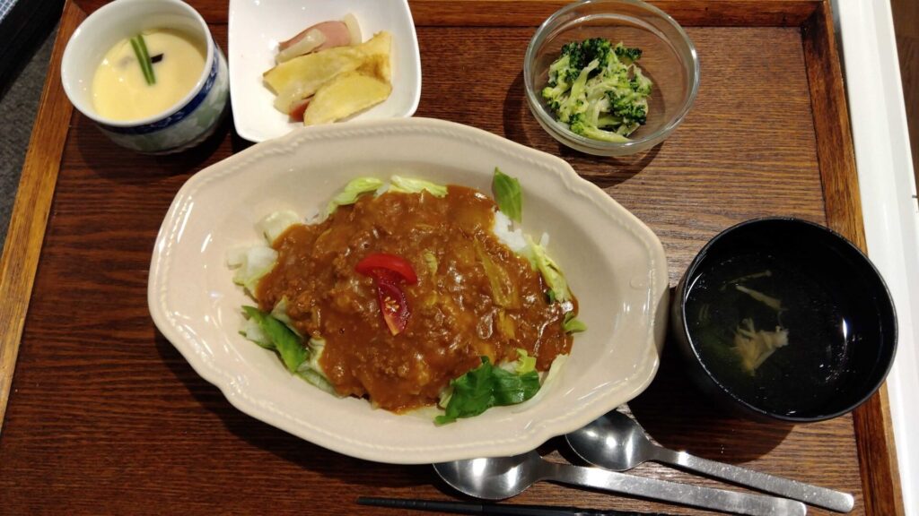 付け合わせは、ウインナーのマスタードポテト・ブロッコリーのオイル風サラダ・コンソメスープ・ごはん・茶碗蒸しです。